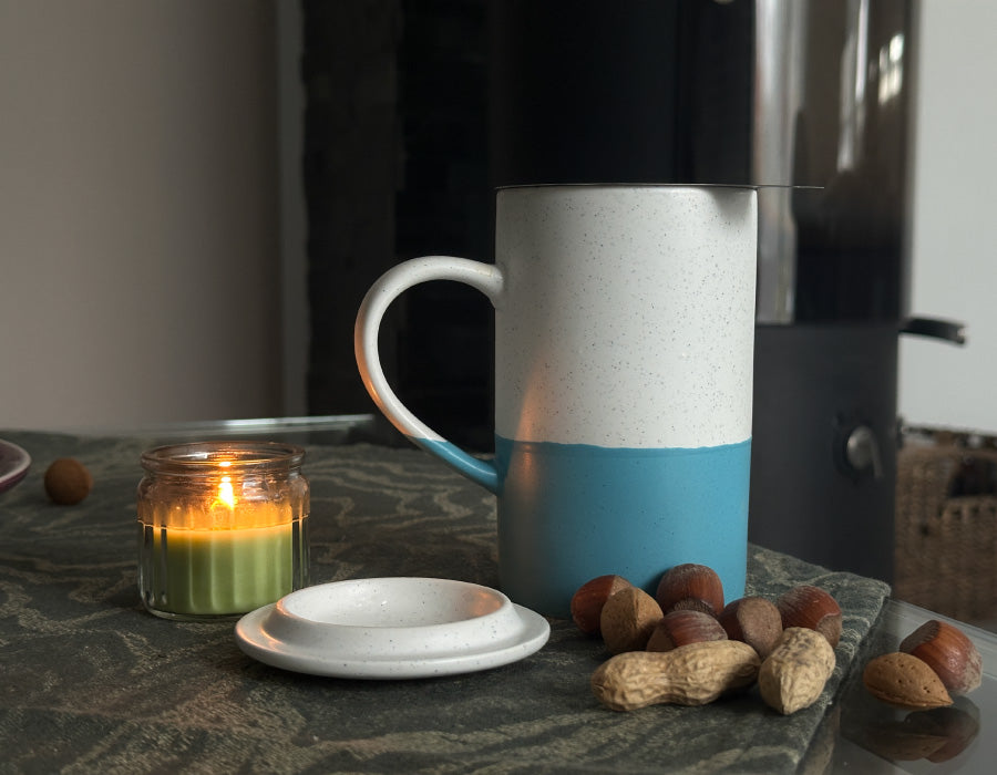 Tasse, Deckel, feines Sieb und Löffel – alles dabei für die Zubereitung, das Ziehenlassen und das Servieren in einem Set.